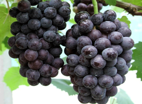 果穗圓錐形或有歧肩,果穗大,平均穗重420克左右,果穗大小整齊,果粒著生緊密。果粒近圓形,自然粒重3.5克左右,經(jīng)赤霉素處理后可達(dá)7.5克,果皮紫黑色,果實(shí)容易著色且上色一致,成熟一致。果粉厚,果皮厚而脆。果肉硬脆,無肉囊,果汁紫紅色,可溶性固形物含量20%,有較濃的草莓香味,無核,品質(zhì)優(yōu)良。